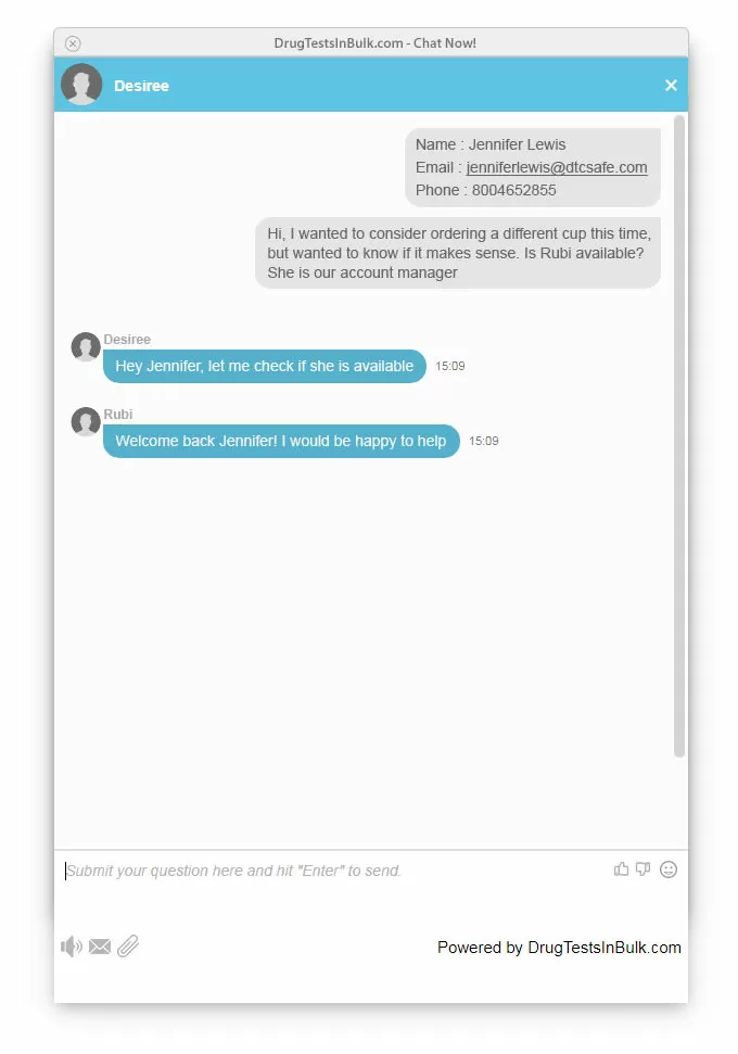 If you have questions about your account, orders, pricing or simply want to chat with a Representative or your Account Manager, you may utilize our Chat function. Click on "Chat Now" button in the right bottom corner of the browser. A new window will pop up, and you will be asked to fill in your name, email and phone. As you are in the chat, you may ask for your Account Representative by simply mentioning their name.